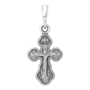 На лицевой стороне креста изображено Распятие. В православной традиции не принято изображать физические страдания Христа на Кресте: Распятие — торжественный, жизнеутверждающий образ спасения всего человечества. Поэтому Спаситель словно парит над миром на кресте, обнимая его распростертыми руками.