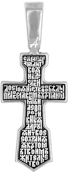 На оборотной стороне креста помещен полный текст тропаря Честному Кресту Господню. Это торжественная молитва Православия, молитва за Отечество. Ее принято читать каждый день, и утром, и вечером: «Cпаси, Господи, люди Твоя, и благослови достояние Твое, победы на сопротивныя даруя, и Твое сохраняя Крестом Твоим жительство».