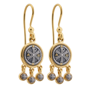 Наши серьги представляют собой два круглых медальона, подвешивающихся с помощью подвижного простого крючка. Внизу медальонов – три шарообразных подвески с изображением четырехконечного креста.