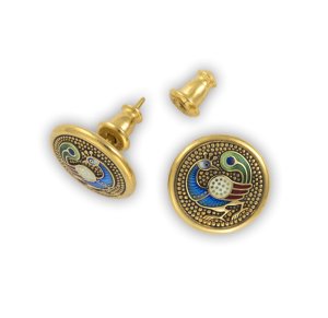 Пусеты представляют собой два круглых медальона с изображениями павлинов, выполненных в технике горячей многоцветной эмали.