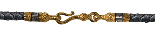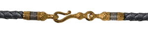 Такой способ соединения цепей и шнуров используется с античных времен и является одним из самых простых и надежных. Концевик продевается в ушко креста и соединяется крючком, закрепленным на втором концевике.