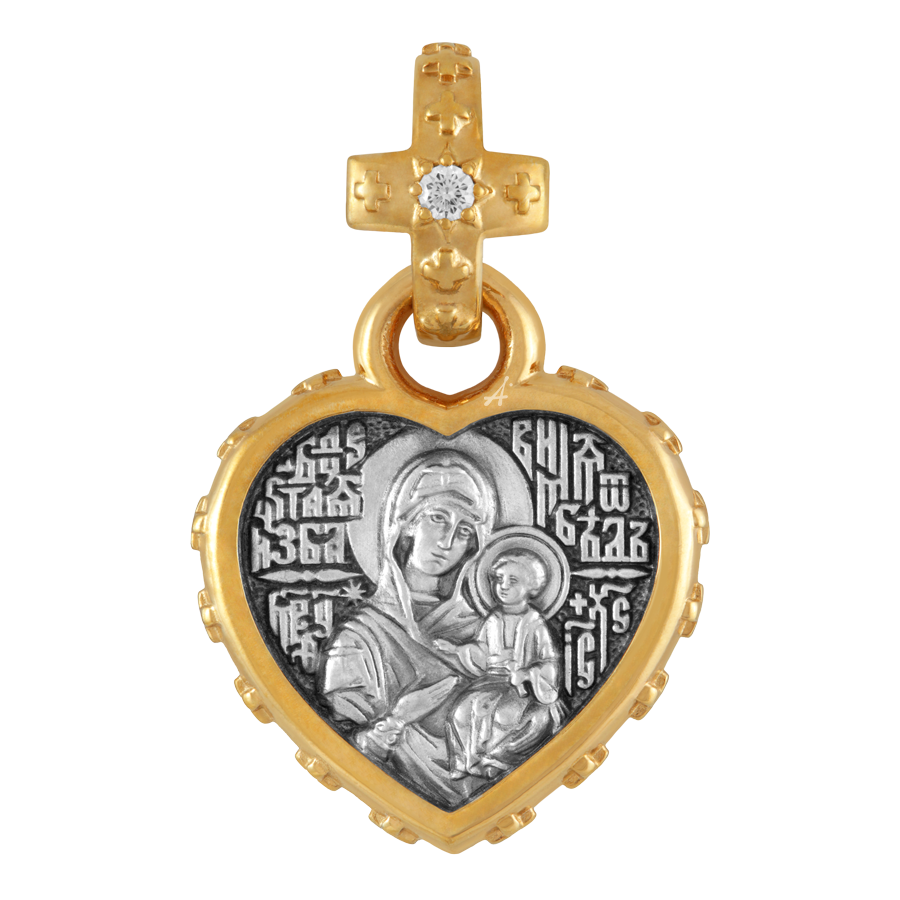 На небольшой образок в форме сердца помещены два особо почитаемых образа: на лицевой стороне — чудотворная Смоленская икона Божией Матери, на обороте — икона великомученика и целителя Пантелеимона. Ушко в виде крестика украшено сияющим фианитом.