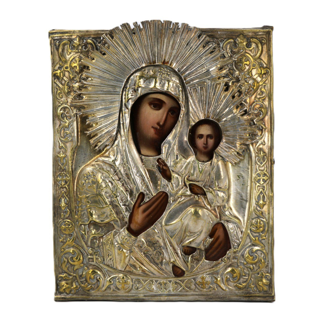19 век. Размер иконы 22*27 см. Липа, левкас, темпера. Оклад латунь