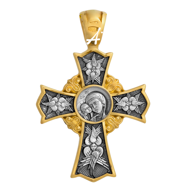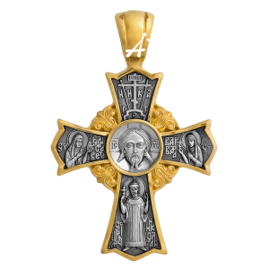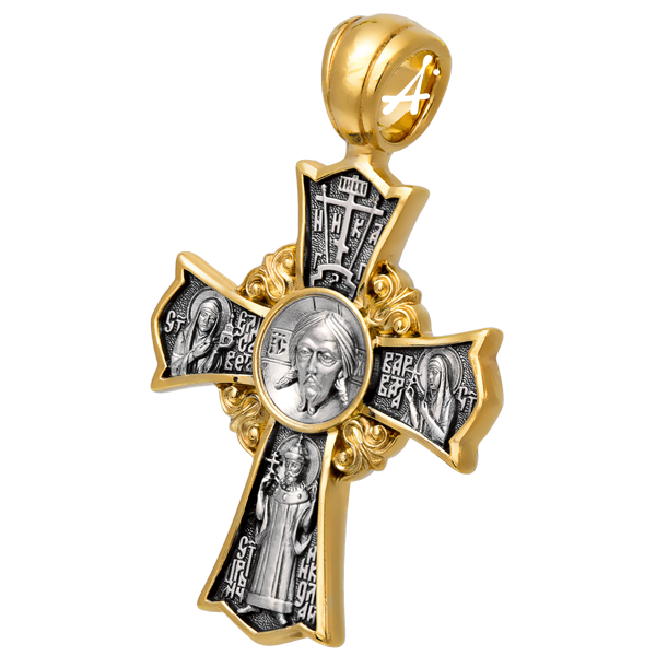 На лицевой стороне креста в центре изображен Образ Спаса Нерукотворного – один из самых почитаемых защитных символов православия. От строгого выразительного лика Спасителя,словно лучи, расходятся трехлепестковые балки креста. Между ними в средокрестиях помещены золотые цветы орнаментальных лилий – символ чистоты и смирения. Вместе с лилиями перекладины креста образуют вокруг Нерукотворного Лика Господа подобие солнечного сияния. Как часть этого сияния стоят, протягивая ко Христу руки, святые мученицы Елизавета, Варвара и царь-страстотерпец Николай II.