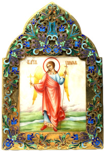 Икона св. Ангел Хранитель, писаная на перламутре, серебро, горячая эмаль. Размер 15*10,5 см