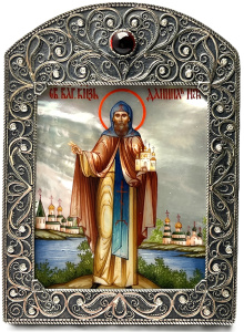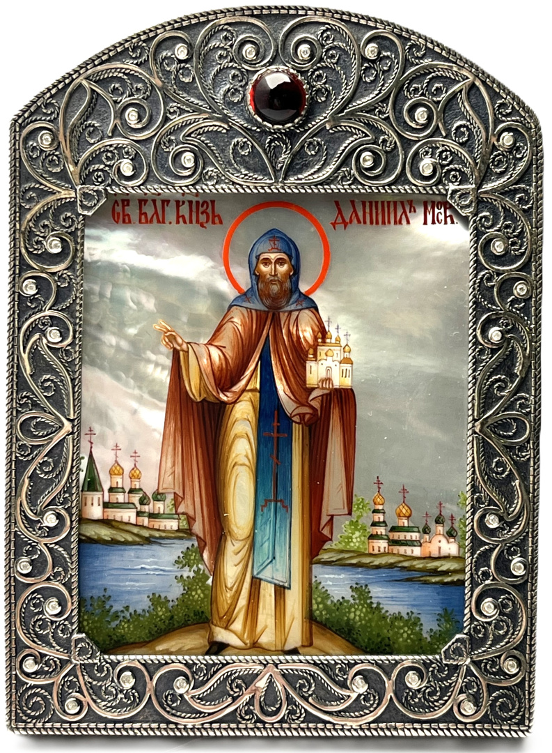 Икона писаная на перламутре. Оклад выполнен из серебра 925 пробы, украшен вставками из одного граната и бриллиантов