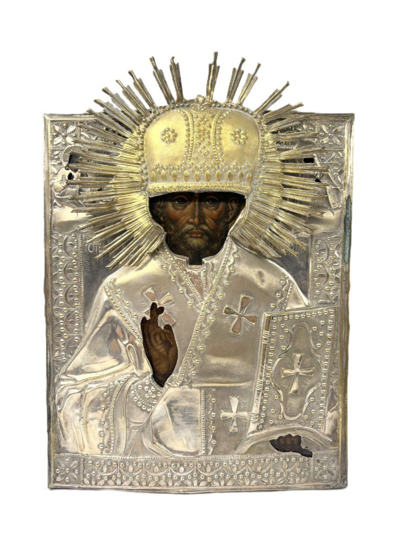 19 век. Размер иконы 21*26 см. Липа, левкас, темпера. Оклад латунь