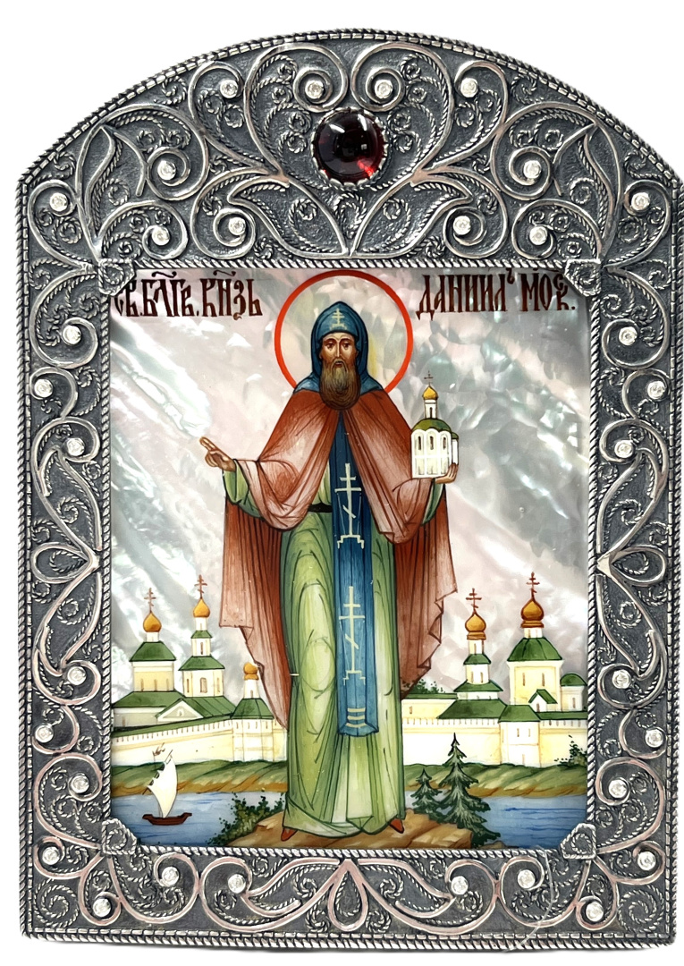 Оклад иконы выполнен из серебра 925 пробы с вставкой из граната и 32 бриллиантов. Лик святого написан на перламутровой вставке.