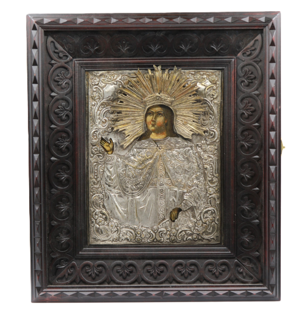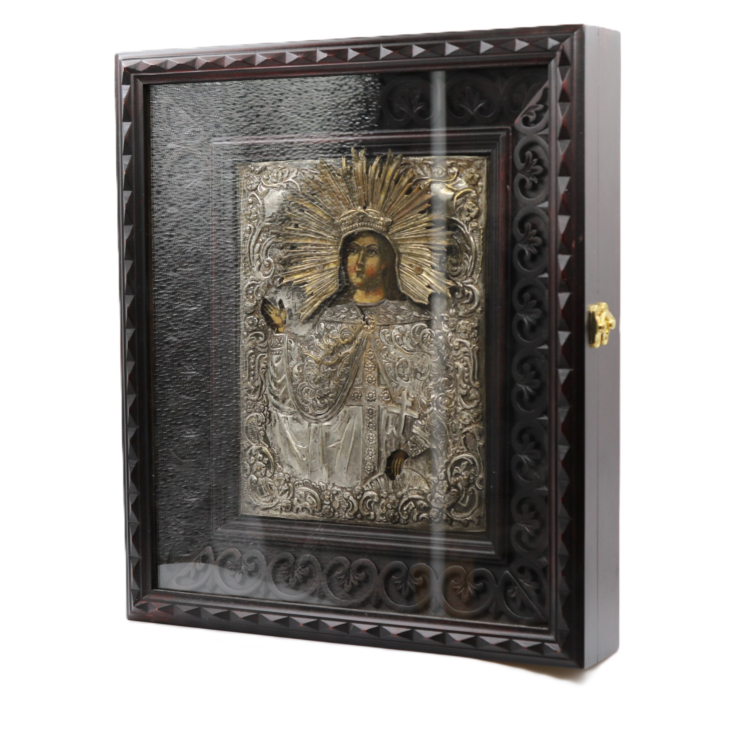 19 век. Размер иконы 30*34 см. Липа, левкас, масло, киот. Оклад латунь