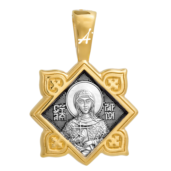 Небольшой образок выполнен в форме восьмиконечной звезды, которую образуют два четырехугольника. Это древнейший христианский символ, обозначающий Божественную Славу. В виде восьмиконечной звезды на иконах часто изображалась мандорла вокруг Христа, в отдельных иконографиях — Его нимб; в восьмиконечном сиянии часто изображался голубь, олицетворяющий Святой Дух; мафорий Пресвятой Богородицы всегда украшают три восьмиконечные звезды. Святая мученица Лариса и Ангел Хранитель, изображенные в такой восьмиконечной форме, словно окружены сиянием Вечности. Они являются в своих иконах из Царства Славы, чтобы явить помощь всем, на них уповающим.