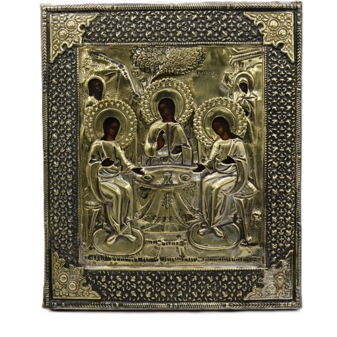 Старинная икона Святой Троицы, 19 век. Размер 31.5х27 см. Оклад латунь