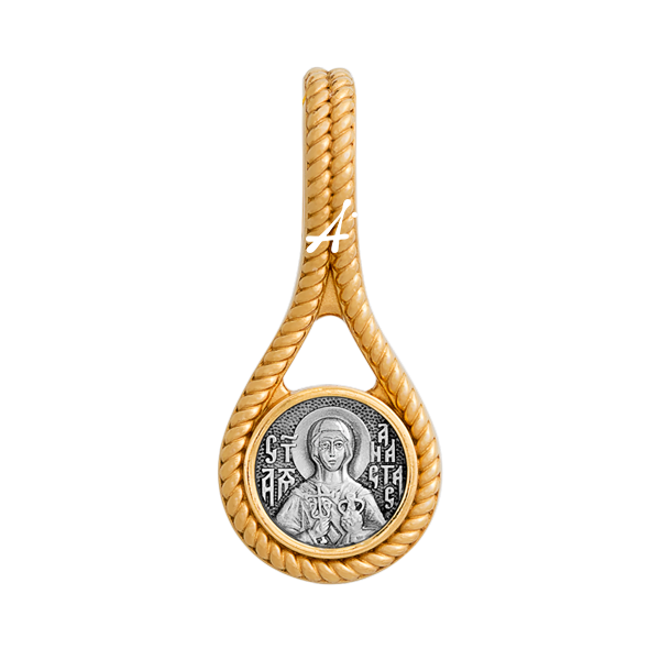 На оборотной стороне образка помещен текст молитвы великомученице Анастаси: «Святая угодница Божия Анастасия, моли Бога о мне грешной».