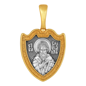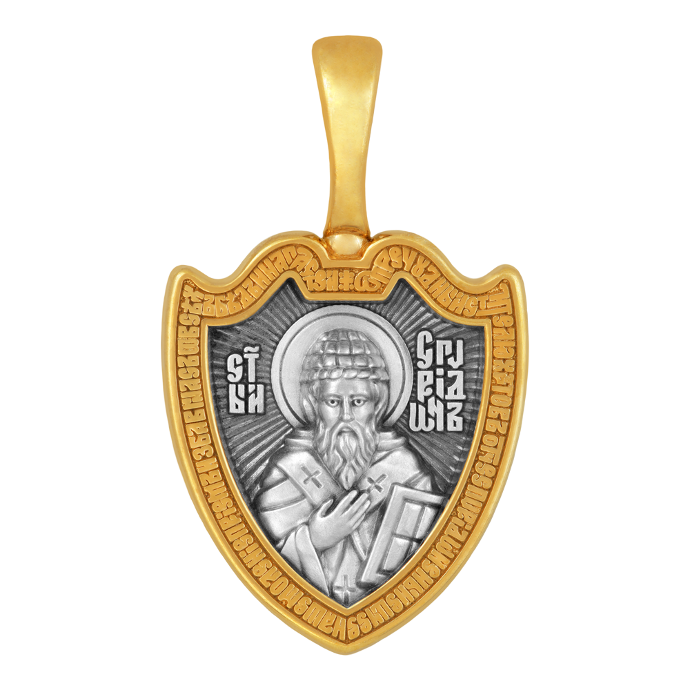 На небольшом серебряном образке в форме щита изображен святитель Спиридон Тримифунтский — один из самых любимых православных святых. Эта форма символически показывает, что свт. Спиридон как щит защищает людей и православную Церковь многие сотни лет. Ему традиционно молятся об исцелении от болезней, помощи в трудных ситуациях, о благополучии в семье, просят помощи в решении вопросов с недвижимостью. Также святитель считается покровителем предпринимателей.