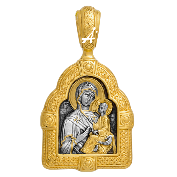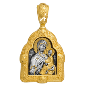 На нательном образке Тихвинская икона изображена в золотом киоте в форме храма. Это образ того драгоценного реликвария, в котором когда-то хранилась чудотворная святыня. Его плетеный орнамент символизирует неразрывность Божественного и тварного, вечного и временного, прошлого и настоящего. Нательная иконка точно