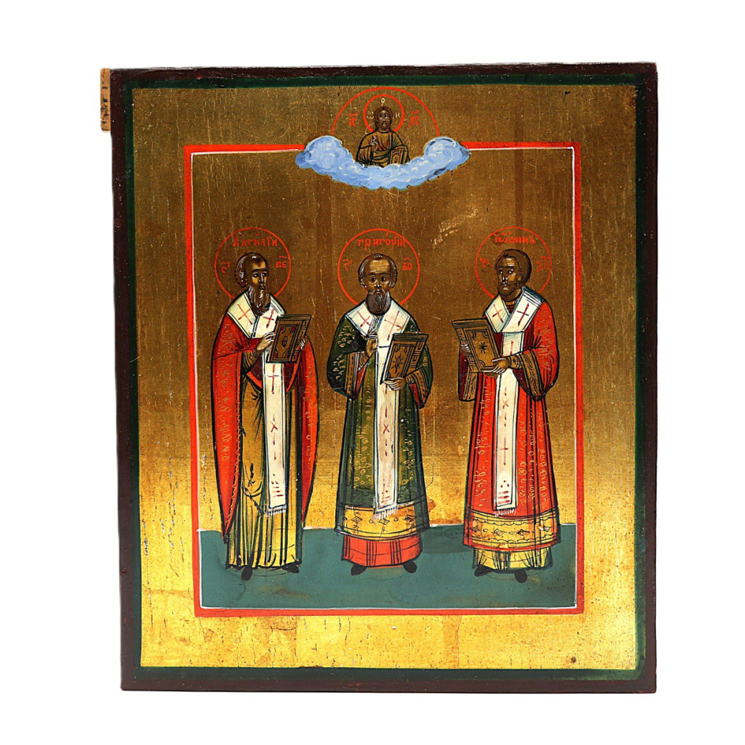 Три Святителя: Василий Великий, Григорий Богослов, Иоанн Златоуст. 19 век. Размер иконы 19*22 см. Липа, левкас, темпера, серебро. Реставрация 2%
