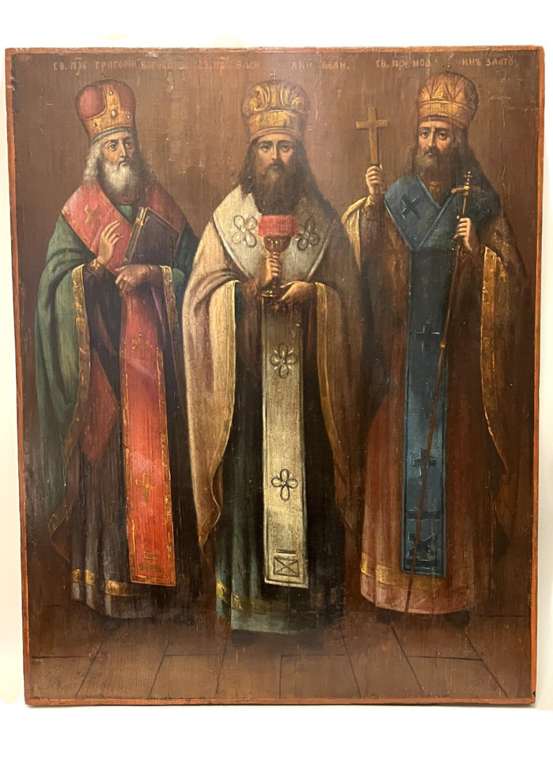 Три Святителя: Василий Великий, Григорий Богослов, Иоанн Златоуст. 19 век. Размер иконы 42*52 см. Липа, левкас, темпера