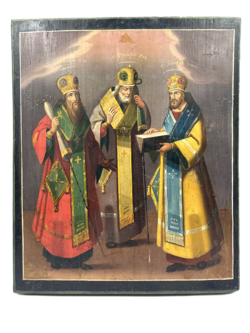 Три Святителя: Василий Великий, Григорий Богослов, Иоанн Златоуст. 19 век. Размер иконы 26*31 см. Липа, левкас, масло