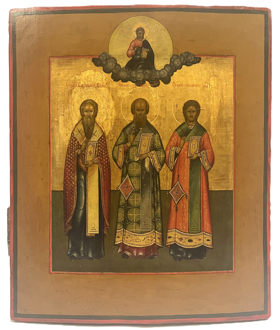 Три Святителя: Василий Великий, Григорий Богослов, Иоанн Златоуст. 19 век. Реставрация 2%. Размер иконы 26*31 см. Липа