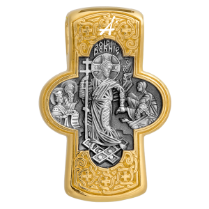 Образ креста с иконой Воскресения Христова и пасхальной стихирой на обороте по своему художественному решению близок древнерусским миниатюрам, в которых плетеный орнамент часто создает в одной форме другую, более сложную и символичную. Здесь в плетеном обрамлении находится форма квадрифолия, традиционная для русских мощевиков и нательных крестов начиная с XIV века.